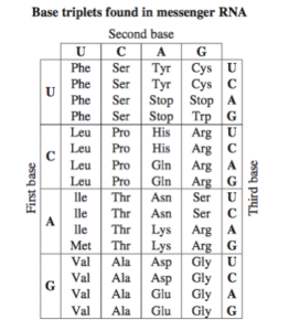 From the table, the amino acid Tryptophan (Trp) can be coded for by the base triplet UGG.