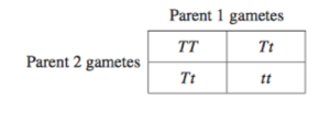 A student completed a genetics exercise by preparing a Punnett square. T represents a dominant allele and t represents a recessive allele.